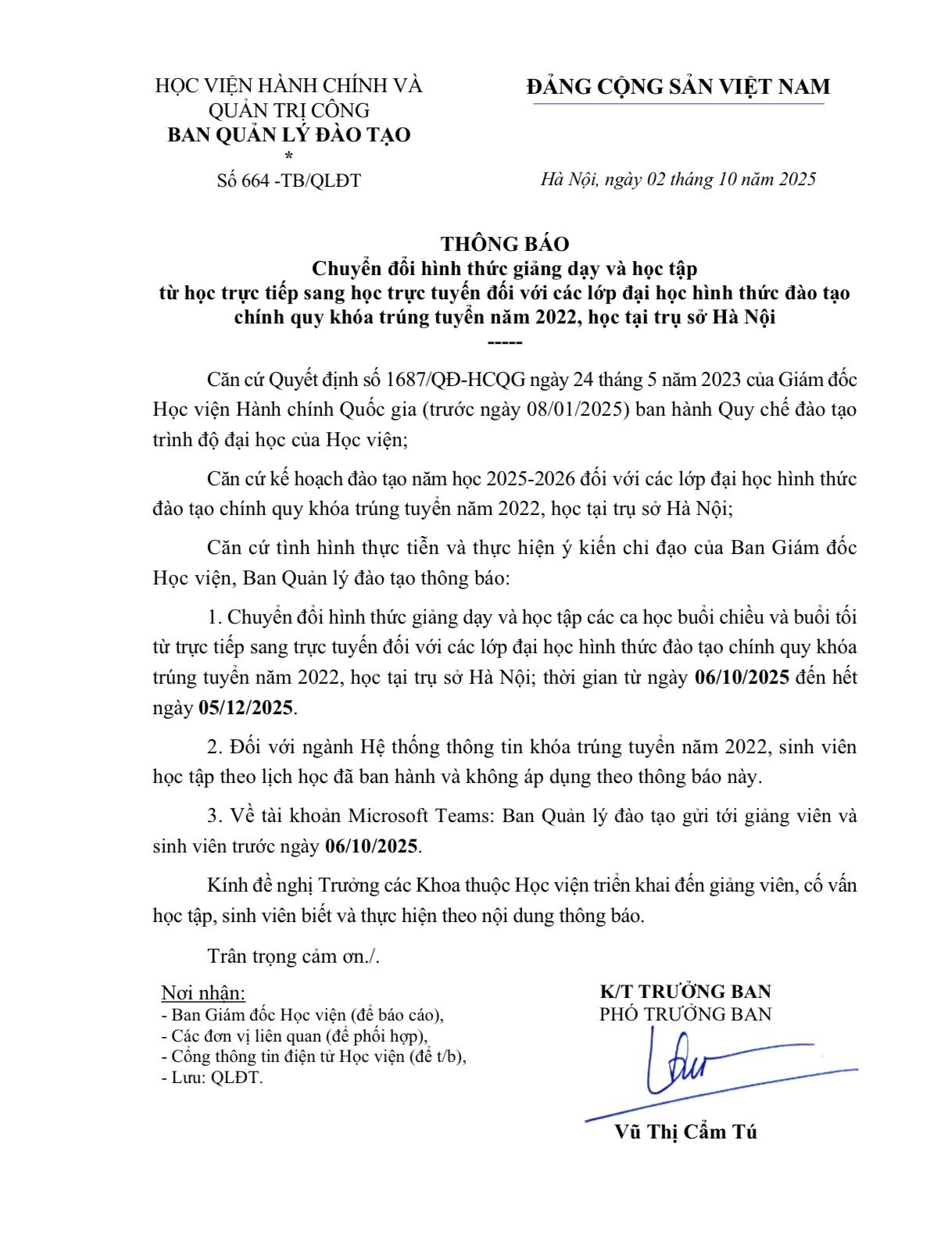 Thông báo Chuyển đổi hình thức giảng dạy và học tập từ học trực tiếp sang học trực tuyến đối với các lớp đại học hình thức đào tạo chính quy khóa trúng tuyển năm 2022, học tại trụ sở Hà Nội