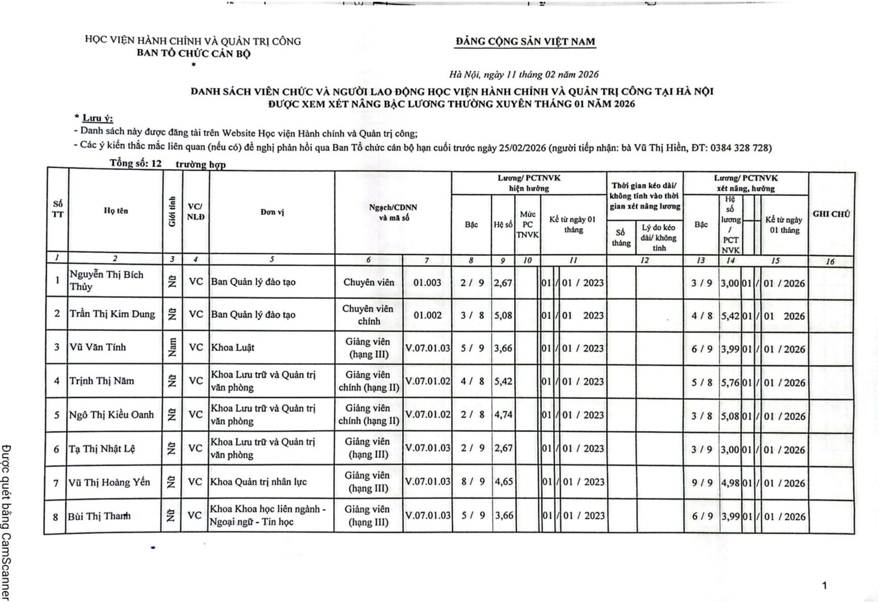 Thông báo danh sách viên chức, người lao động được xem xét nâng bậc lương thường xuyên tháng 01.2026
