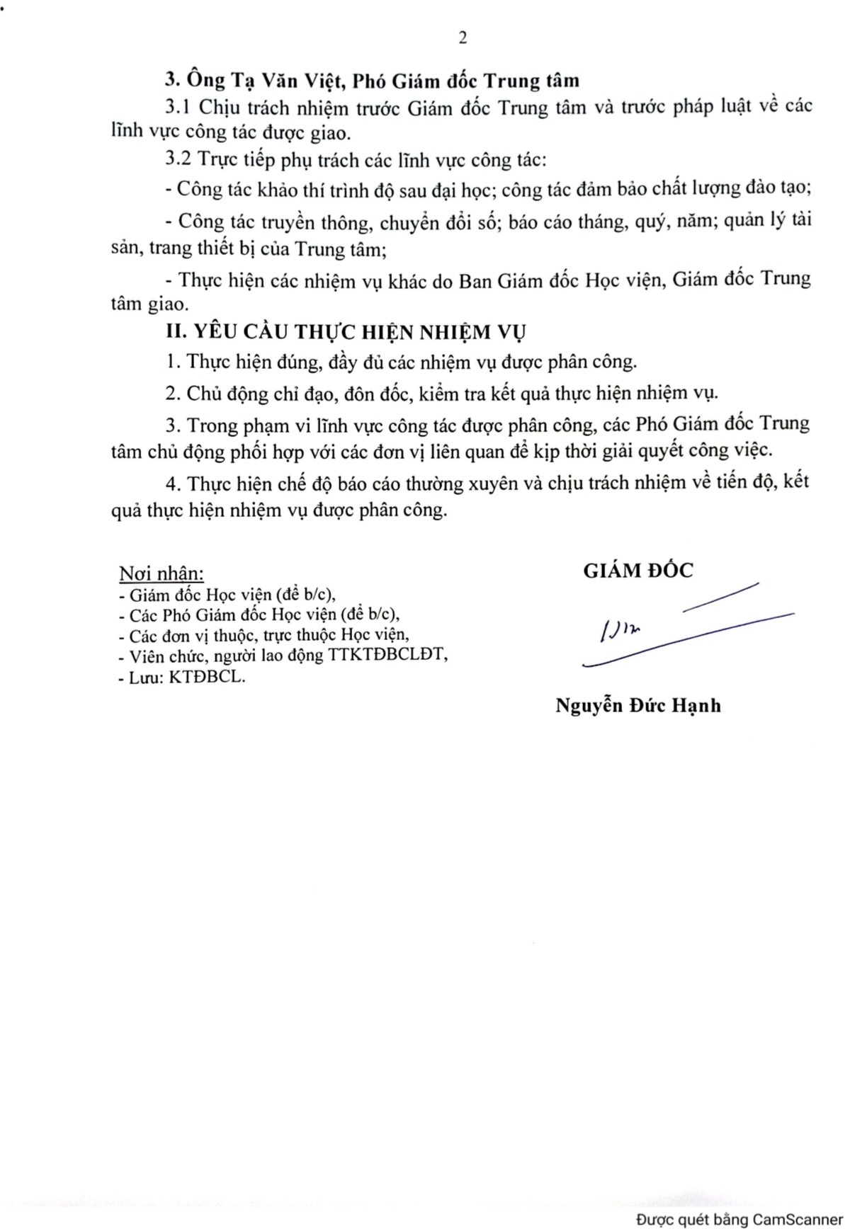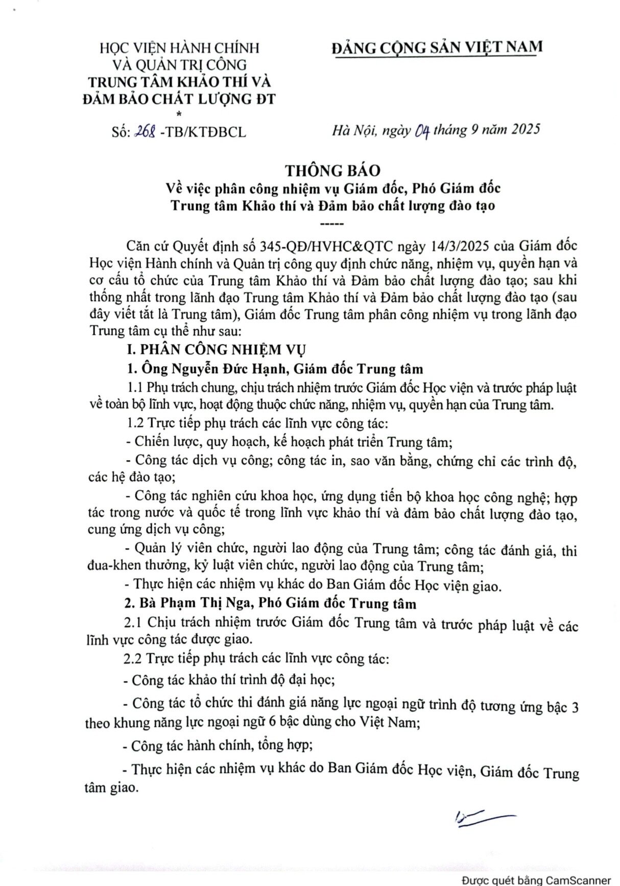 Thông báo phân công nhiệm vụ Giám đốc, Phó Giám đốc Trung tâm
