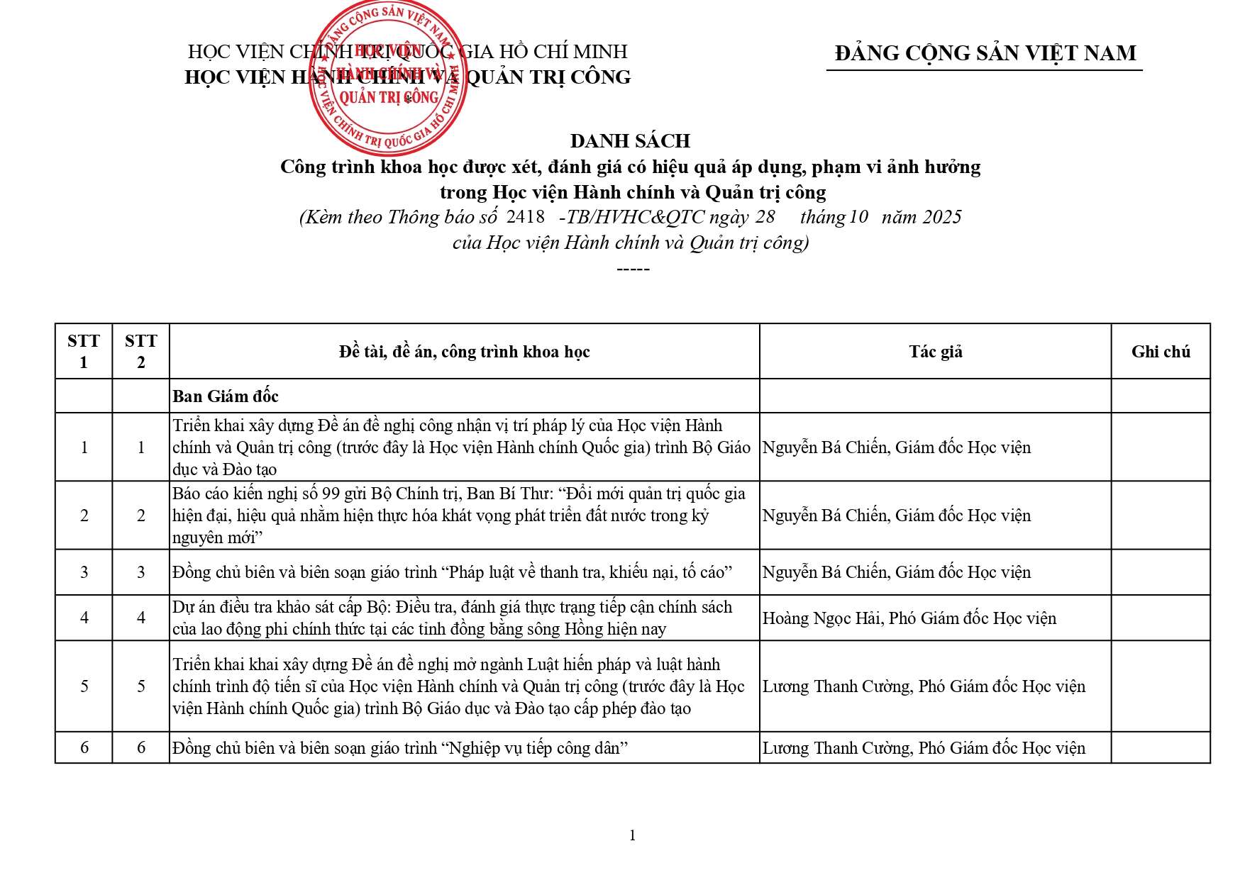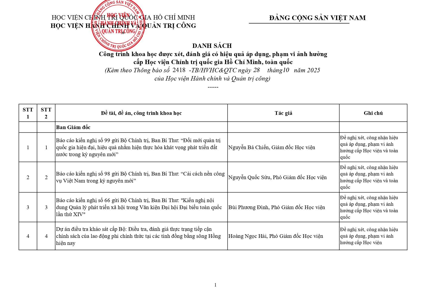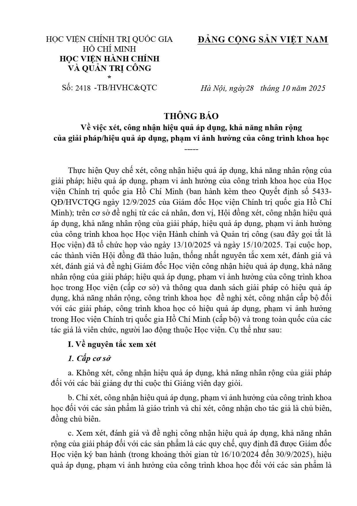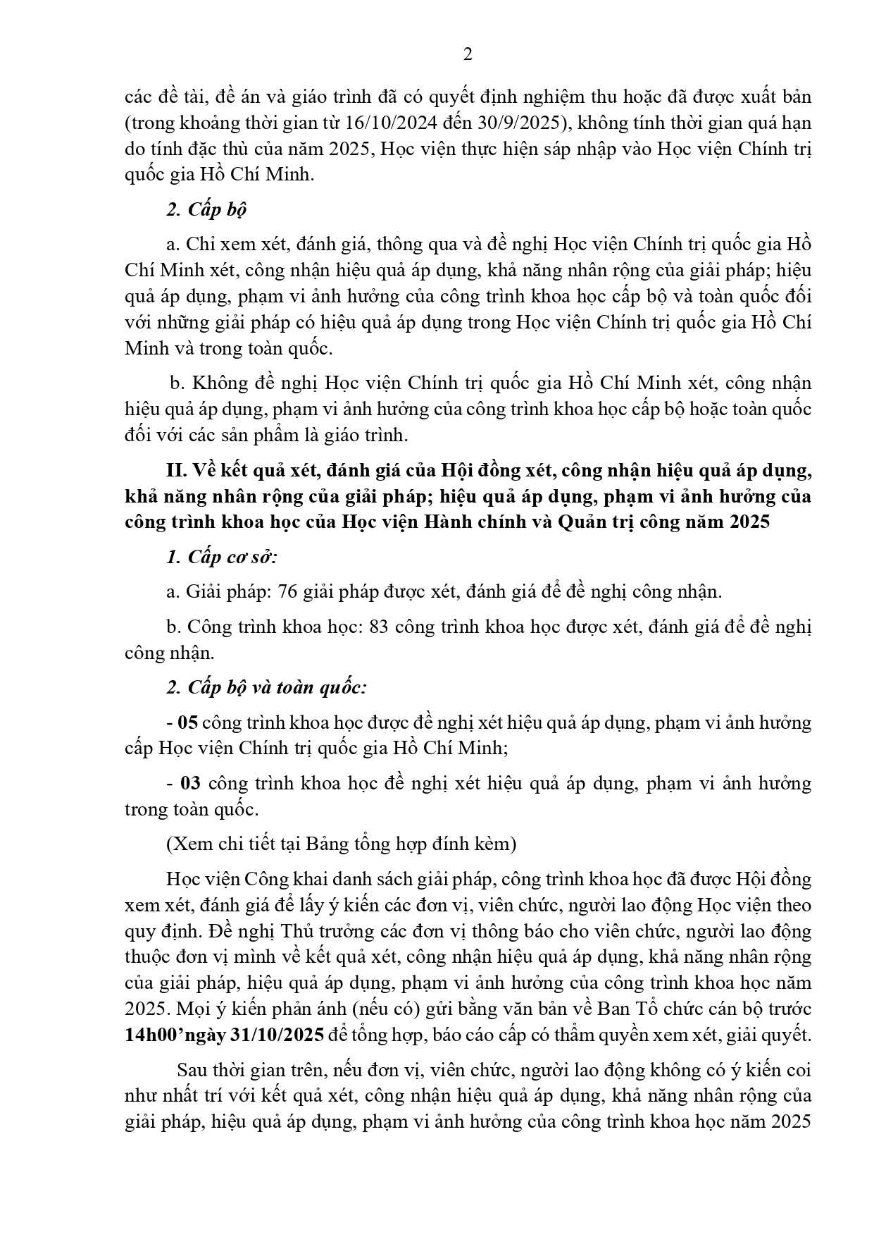 Thông báo về việc xét, công nhận hiệu quả áp dụng, khả năng nhân rộng của giải pháp/hiệu quả áp dụng, phạm vi ảnh hưởng của công trình khoa học