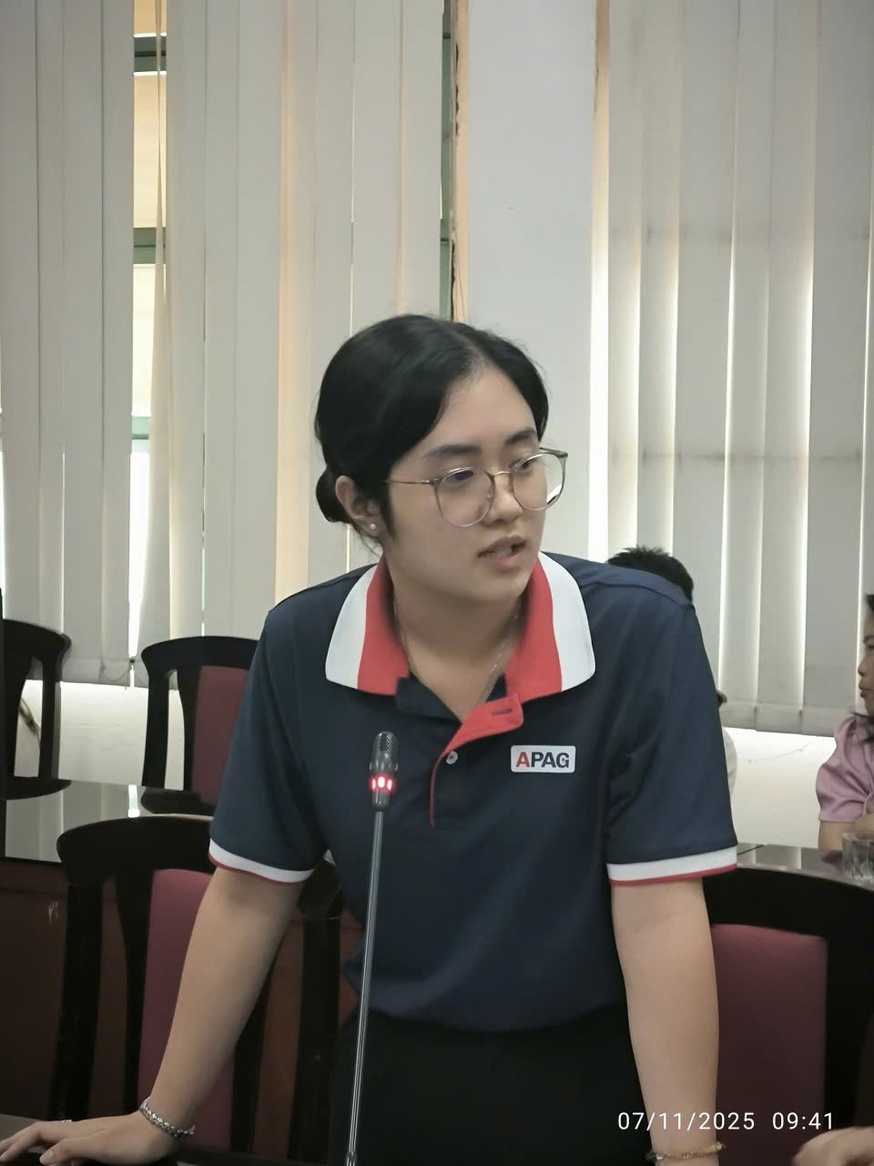 Sinh viên Nguyễn Hoàng Mỹ Tâm, Chi ủy viên Chi bộ Sinh viên 3, lớp 2305LHOC, Phân hiệu Học viện Hành chính và Quản trị công tại TP. Hồ Chí Minh tham luận.