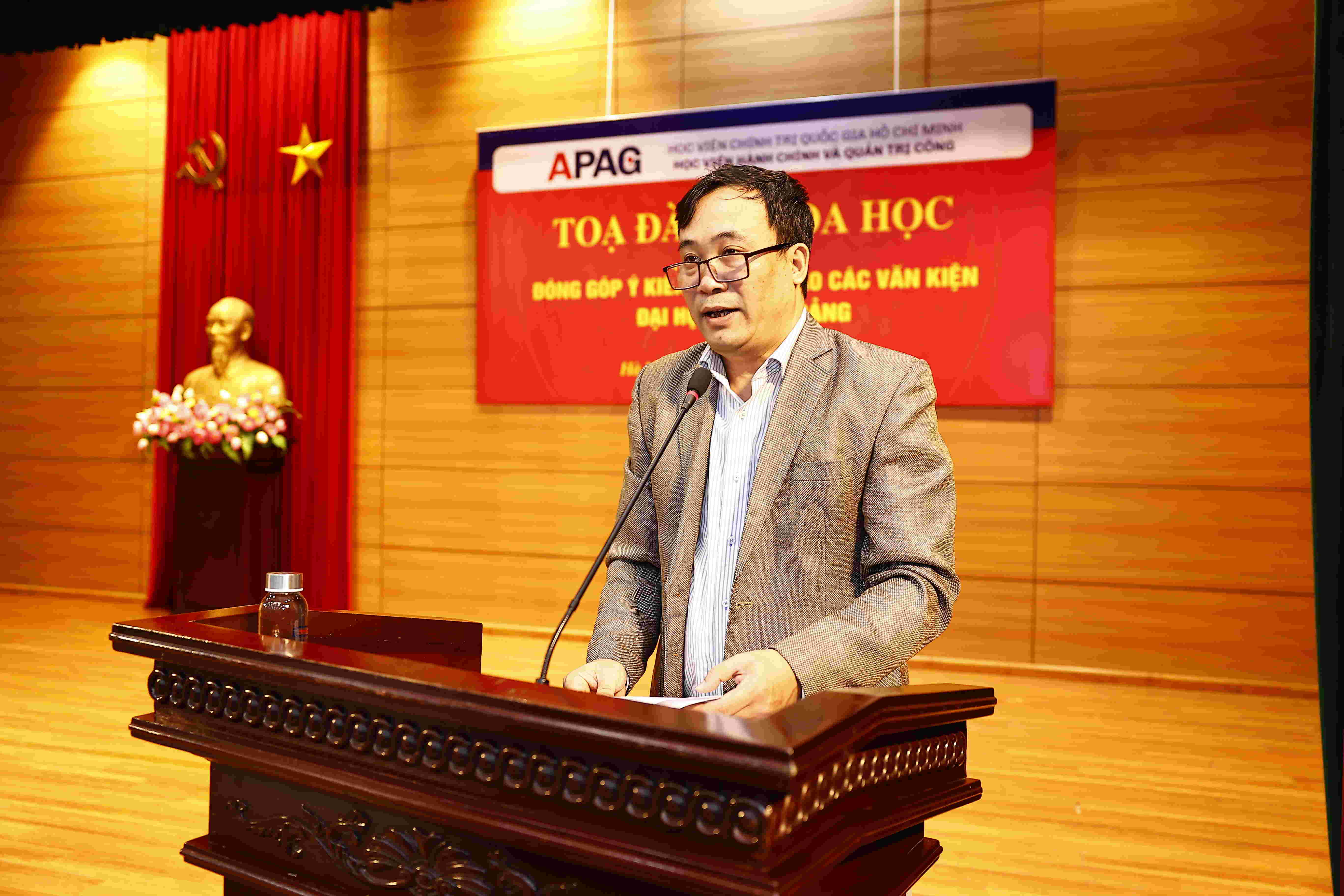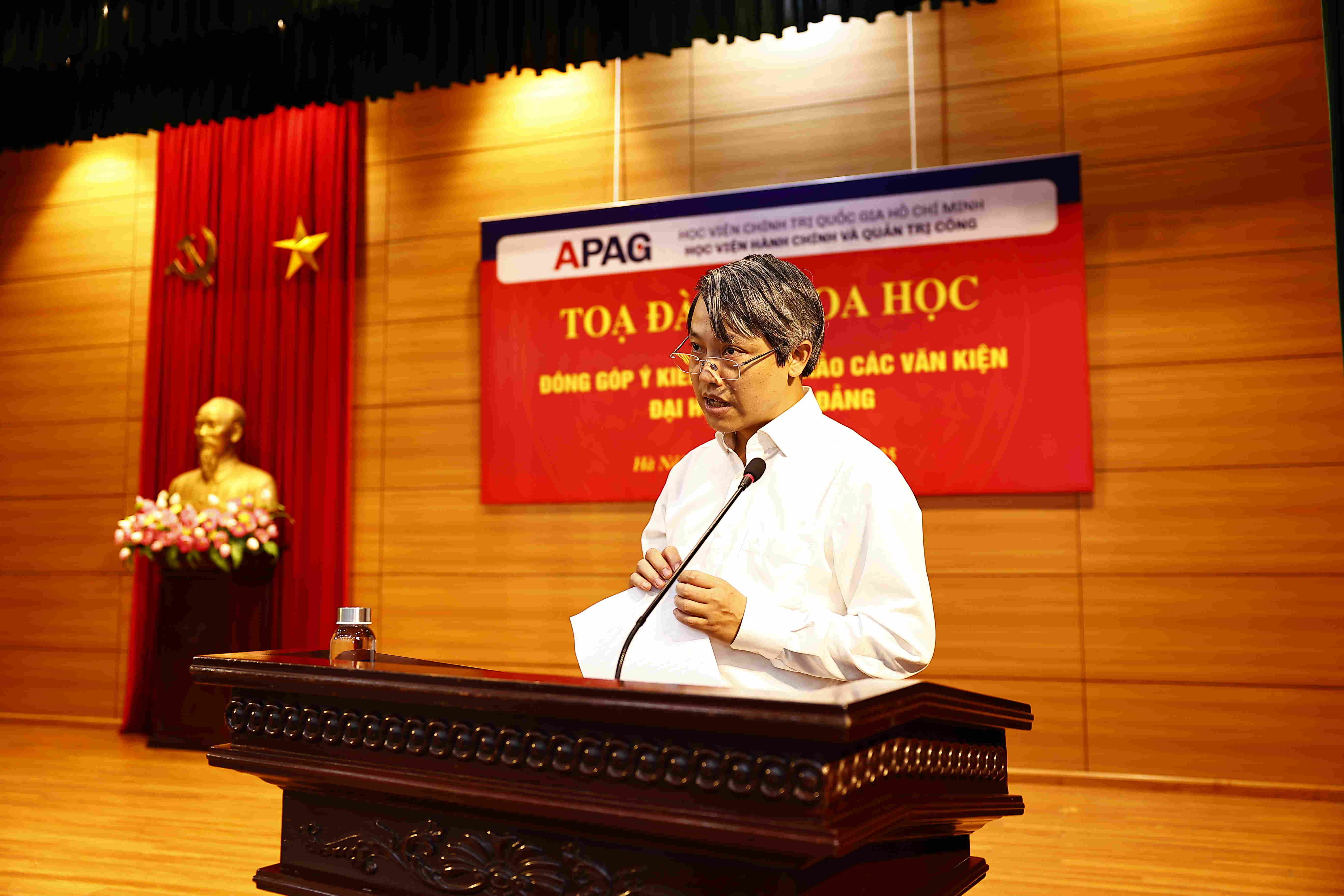 PGS.TS. Lương Thanh Cường, Phó Bí thư Đảng ủy, Phó Giám đốc Học viện phát biểu tổng kết.Phát biểu kết luận Tọa đàm, PGS. TS. Lương Thanh Cường, Phó Bí thư Đảng ủy, Phó Giám đốc Học viện Hành chính và Quản trị công đánh giá cao tinh thần trách nhiệm và những ý kiến đóng góp tâm huyết, có giá trị khoa học và thực tiễn sâu sắc từ đội ngũ cán bộ, giảng viên của Học viện đối với sự kiện chính trị trọng đại của đất nước. Học viện sẽ khẩn trương tổng hợp, chắt lọc các ý kiến chất lượng nhất để gửi về Tiểu ban Văn kiện, góp phần hoàn thiện các dự thảo, bảo đảm Văn kiện Đại hội XIV của Đảng thật sự là kết tinh trí tuệ của toàn Đảng, toàn dân. Các kết quả góp ý tại Tọa đàm khẳng định vai trò tiên phong của Học viện trong công tác nghiên cứu khoa học, cung cấp luận cứ khoa học cho việc hoạch định và hoàn thiện đường lối, chủ trương của Đảng và Nhà nước.