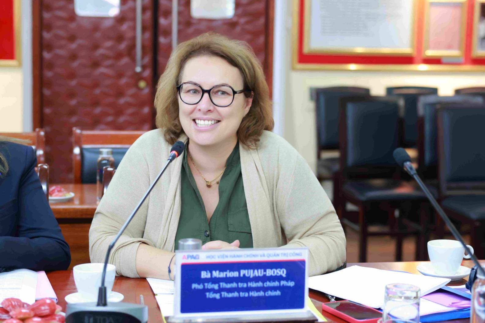 Bà Trần Lan Hương, đại diện Đại sứ quán Pháp tại Việt Nam đánh giá cao vai trò của Học viện trong đào tạo và bồi dưỡng nguồn nhân lực hành chính, đồng thời nhấn mạnh tầm quan trọng của việc xây dựng cơ chế liêm chính mạnh mẽ trong thanh tra, nhằm bảo đảm niềm tin của người dân và chất lượng quản trị quốc gia.