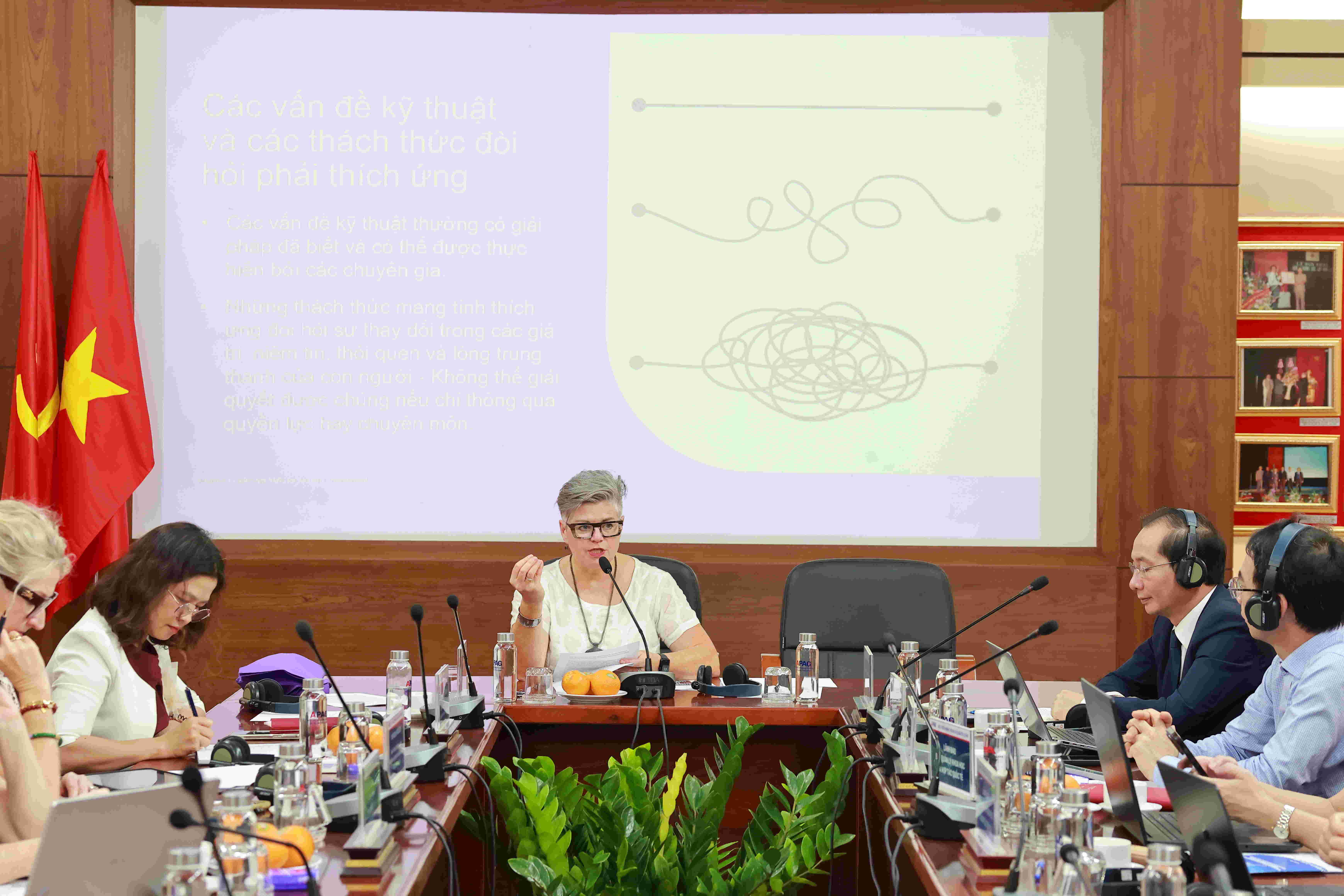 Tại Tọa đàm, Giáo sư Heather Zwicker đã trình bày tham luận xoay quanh khái niệm “lãnh đạo thích ứng” (adaptive leadership), cách tiếp cận do Giáo sư Ronald A. Heifetz (Đại học Harvard) khởi xướng, nhấn mạnh vai trò của lãnh đạo trong việc huy động con người cùng giải quyết các thách thức phức tạp và thúc đẩy phát triển bền vững.