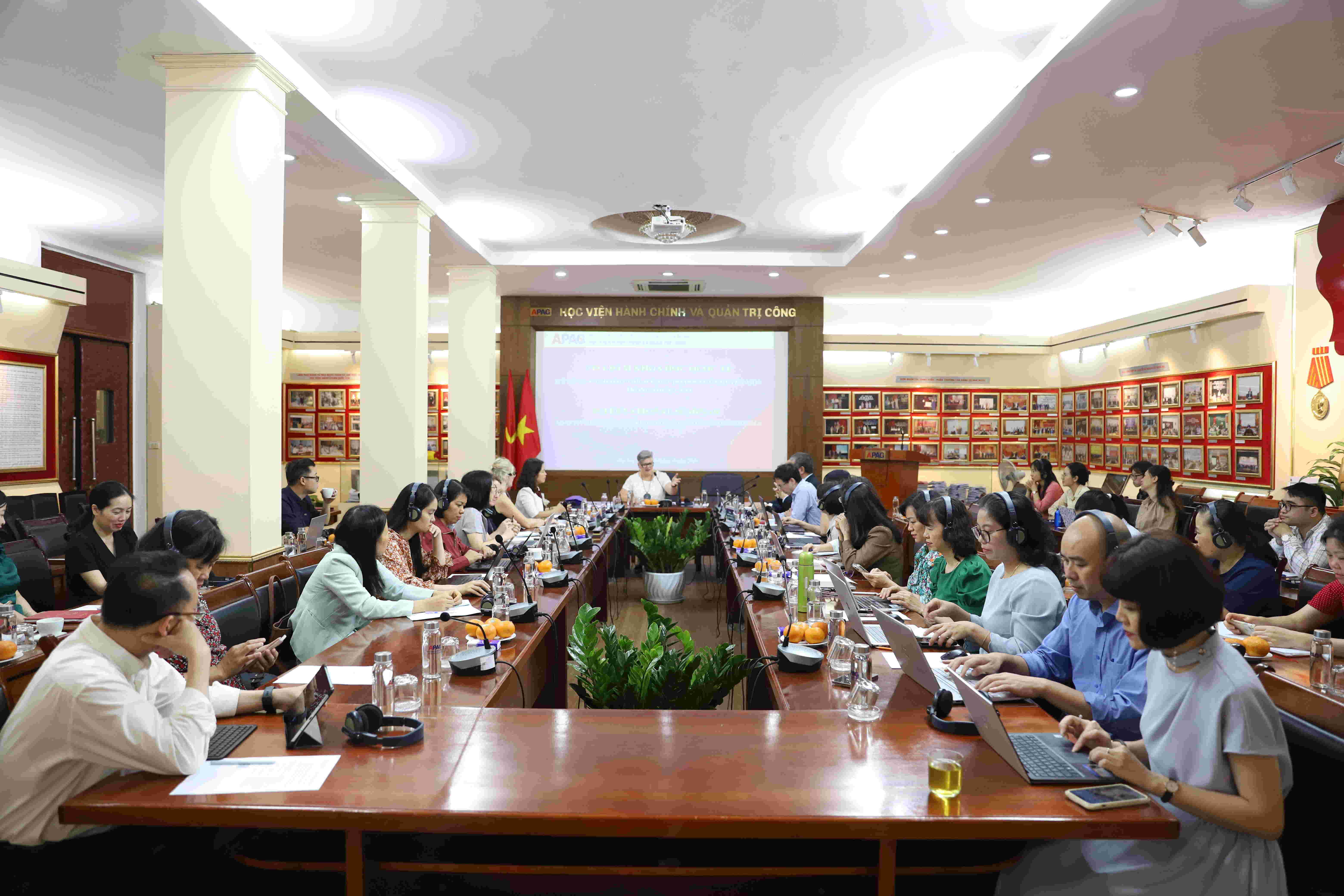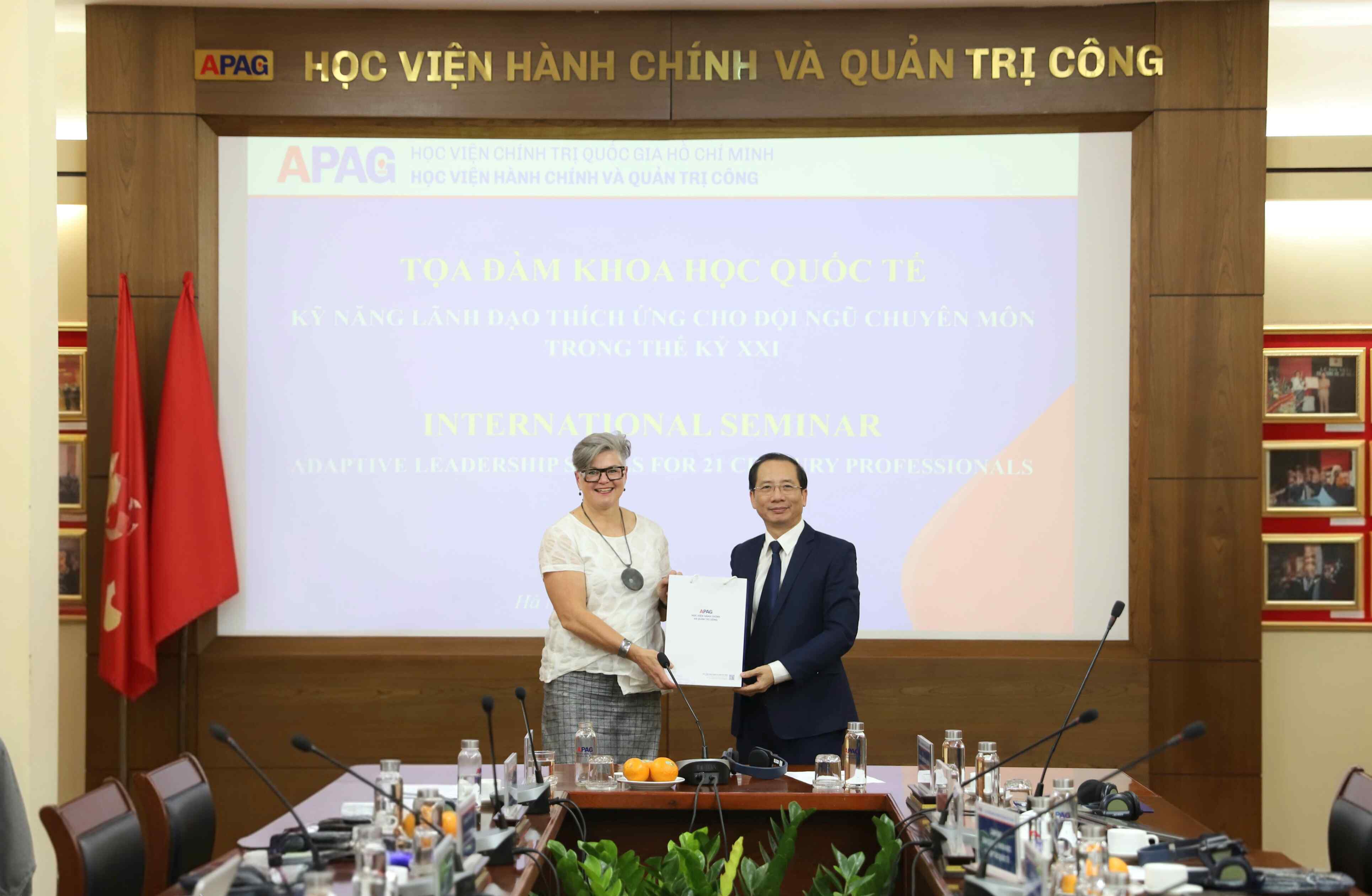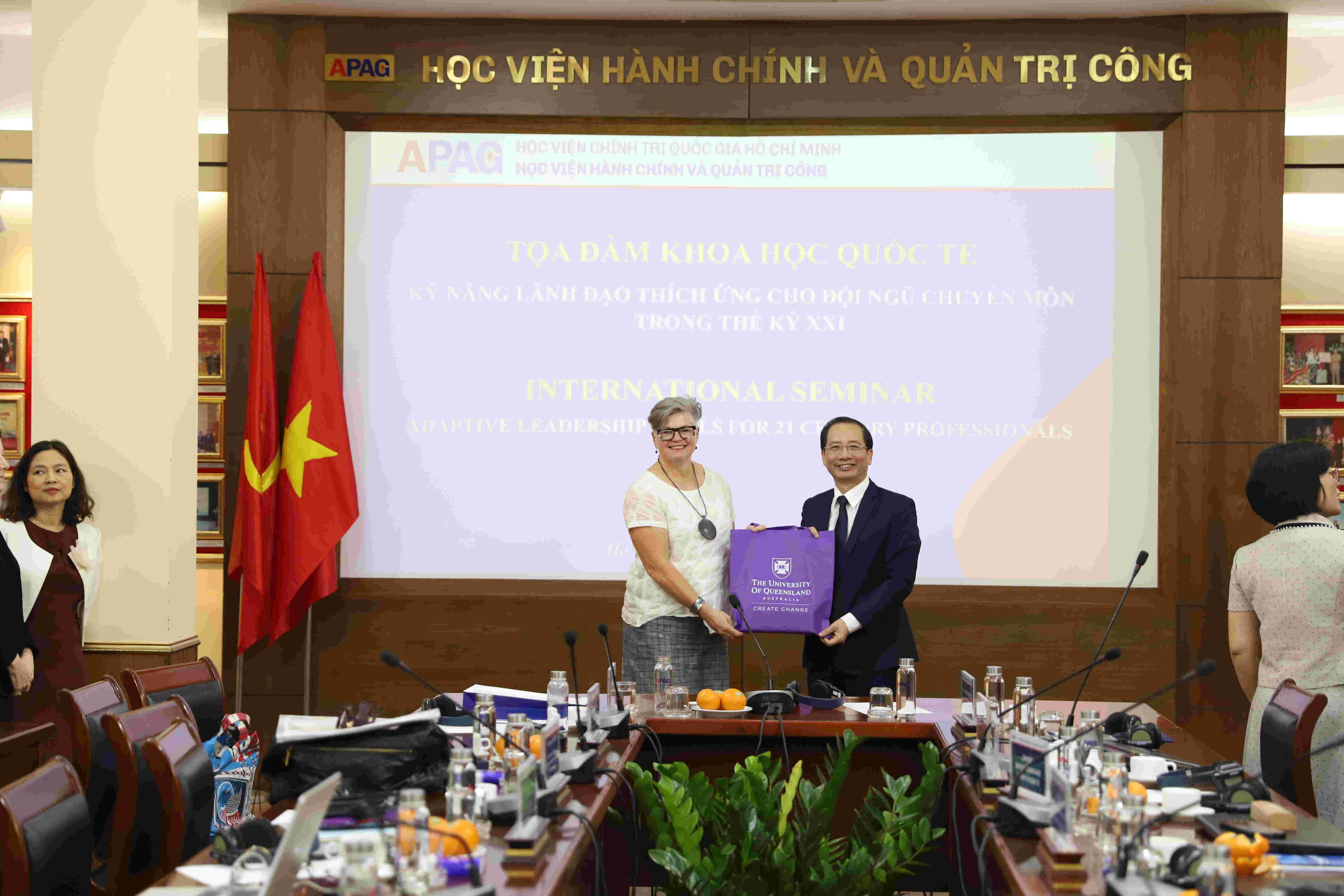 Toàn cảnh buổi Tọa đàm Tham dự Tọa đàm có đại diện Đại sứ quán Australia tại Việt Nam; các chuyên gia quốc tế gồm Giáo sư Heather Zwicker - Phó Hiệu trưởng phụ trách Văn hóa và Lãnh đạo, Đại học Queensland; Bà Kim Cleary - Giám đốc Trung tâm Việt - Úc; cùng các chuyên gia, điều phối viên hợp tác quốc tế. Về phía Học viện Hành chính và Quản trị công có PGS.TS. Nguyễn Bá Chiến, Bí thư Đảng ủy, Giám đốc Học viện; PGS.TS. Lương Thanh Cường, Phó Giám đốc Học viện; TS. Bùi Phương Đình, Phó Giám đốc Học viện cùng lãnh đạo các đơn vị, giảng viên, viên chức tham dự.