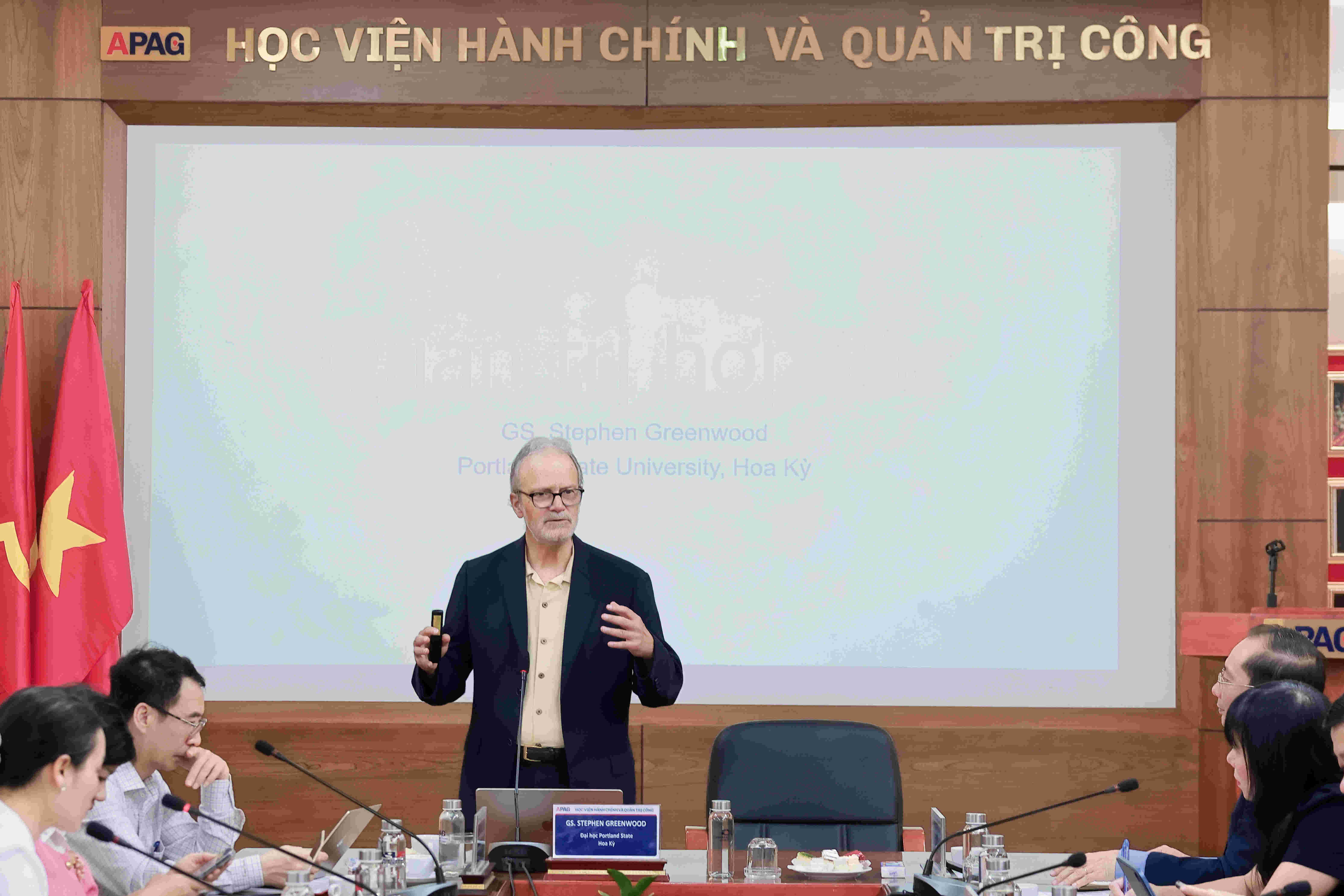 GS. Stephen Greenwood trình bày tại Tọa đàm.Tại Tọa đàm, GS. Stephen Greenwood đã trình bày tổng quan về quản trị hợp tác (collaborative governance) - được hiểu là quá trình các chủ thể thuộc khu vực công, khu vực tư và các tổ chức xã hội phối hợp với nhau theo phương thức có cấu trúc nhằm đạt được mục tiêu công. Theo đó, thay vì dựa chủ yếu vào mô hình quản lý thứ bậc truyền thống, quản trị hợp tác đề cao sự phối hợp đa bên, chia sẻ trách nhiệm và huy động nguồn lực từ nhiều chủ thể khác nhau.