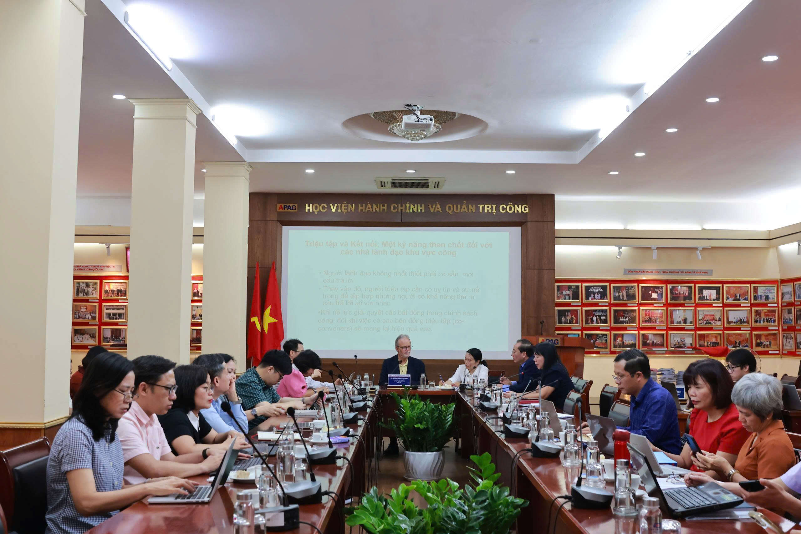 Quang cảnh Tọa đàm.Tham dự Tọa đàm có GS. Stephen Greenwood - chuyên gia về quản trị hợp tác và xây dựng đồng thuận chính sách, nghiên cứu viên cao cấp tại Trung tâm Đồng thuận Chính sách Quốc gia, Đại học Portland State (Hoa Kỳ). Về phía Học viện Hành chính và Quản trị công có PGS.TS. Lương Thanh Cường, Phó Giám đốc Học viện; TS. Bùi Phương Đình, Phó Giám đốc Học viện; cùng lãnh đạo các khoa, ban, đơn vị và đông đảo viên chức, giảng viên Học viện.