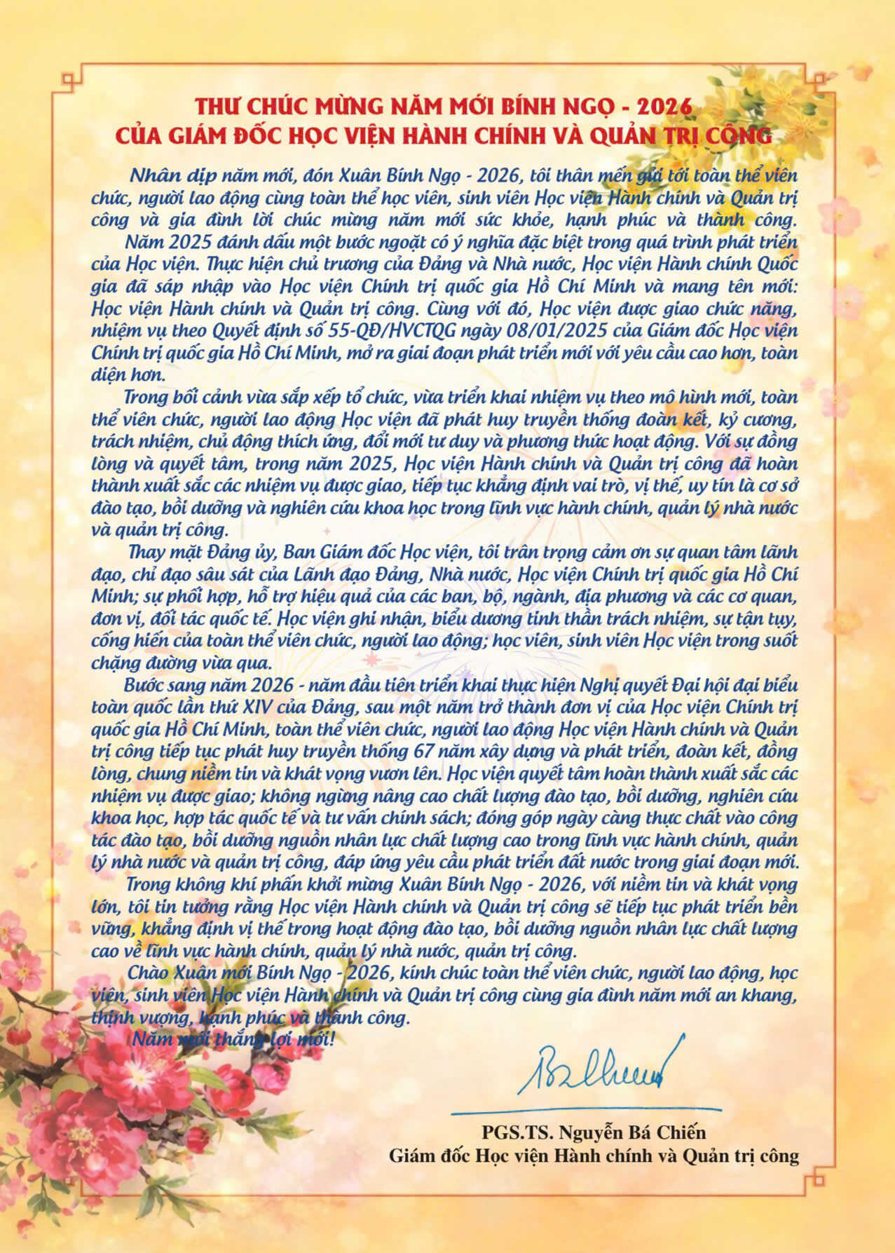 (apag.edu.vn) - Nhân dịp năm mới, đón Xuân Bính Ngọ 2026, PGS.TS. Nguyễn Bá Chiến - Giám đốc Học viện Hành chính và Quản trị công thân mến gửi tới toàn thể viên chức, người lao động cùng toàn thể học viên, sinh viên Học viện và gia đình lời chúc mừng năm mới sức khỏe, hạnh phúc và thành công.